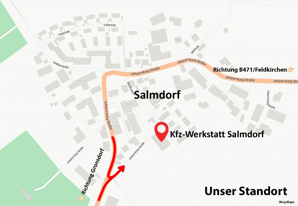 Die Einfahrt zur Werkstatt befindet sich gegenüber des Steakhouse „T-Bone“ in Salmdorf.